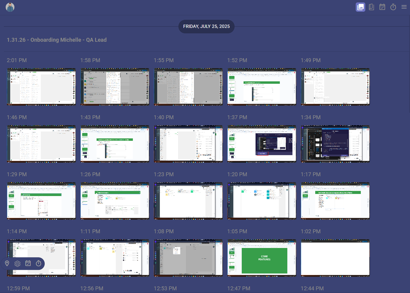 - By date: Screenshots inside each task group are organized by date. This creates a timeline that shows how work progressed across the workday.