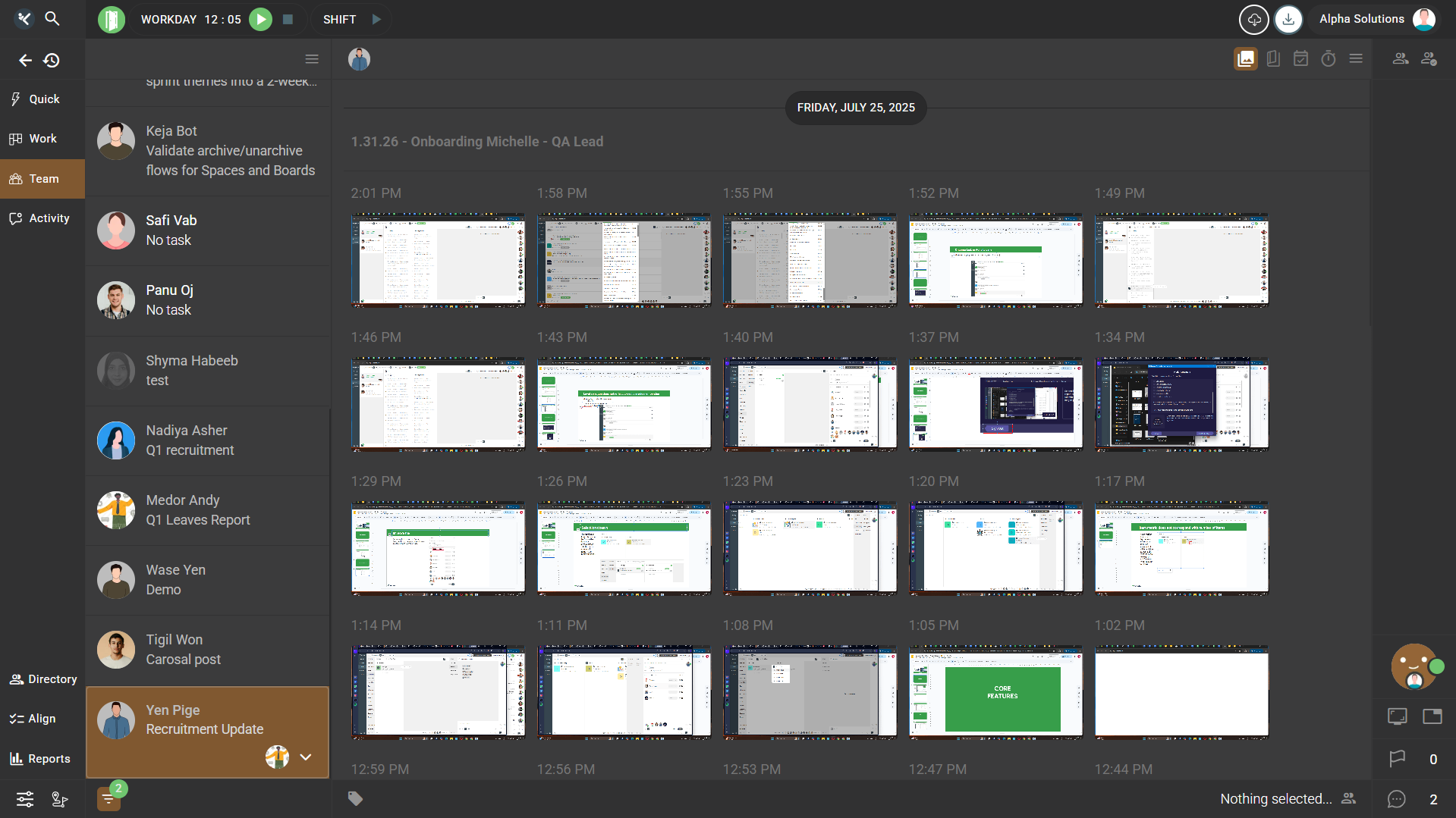 Desktop Screenshots introduce a form of operational evidence. They capture the state of the worker’s desktop during the workday and provide visual context that complements tasks and conversations.
