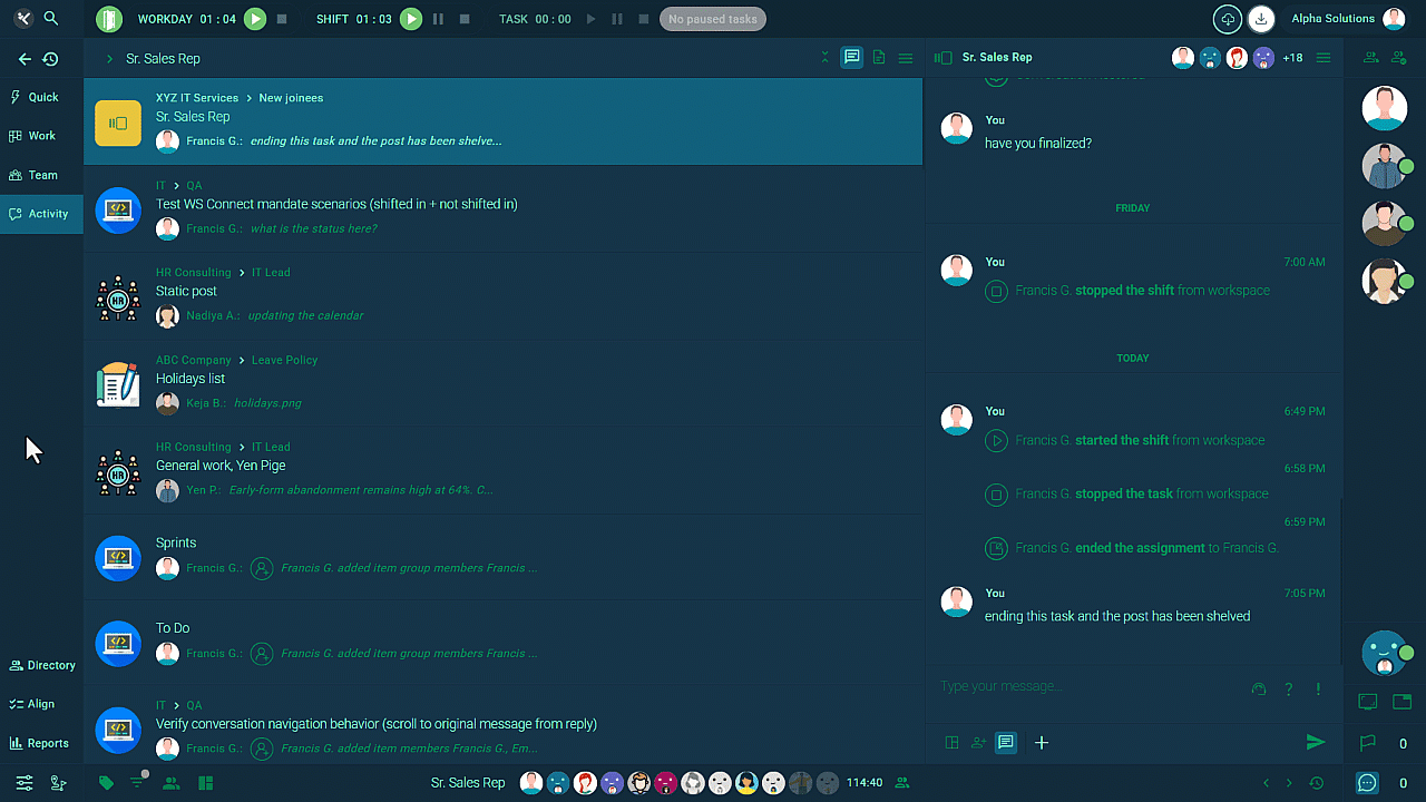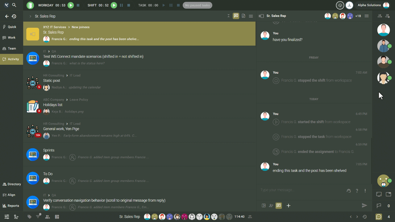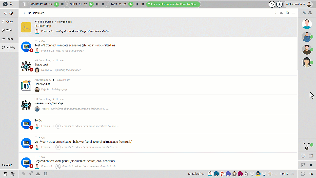 Centralized activity stream – The Activity Panel consolidates tasks, conversations, filters, and notifications into a structured feed.