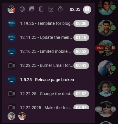 The Task pill in the top time panel has been refined to better reflect active work. Clicking the Task pill now surfaces only your open tasks, so task switching stays focused on what is currently actionable. The top panel continues to show Workday, Shift, and Task pills, each with their own timers.