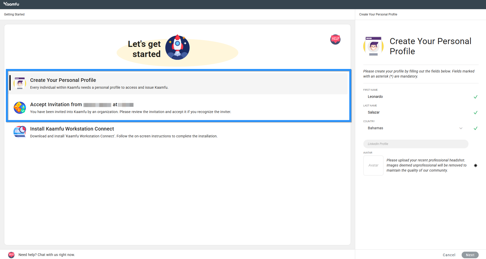 The download and installation process begins with an invitation email and is completed through the Getting Started page in the Kaamfu Web App. Once installed, the application launches on your desktop and connects to your organization’s workspace.
