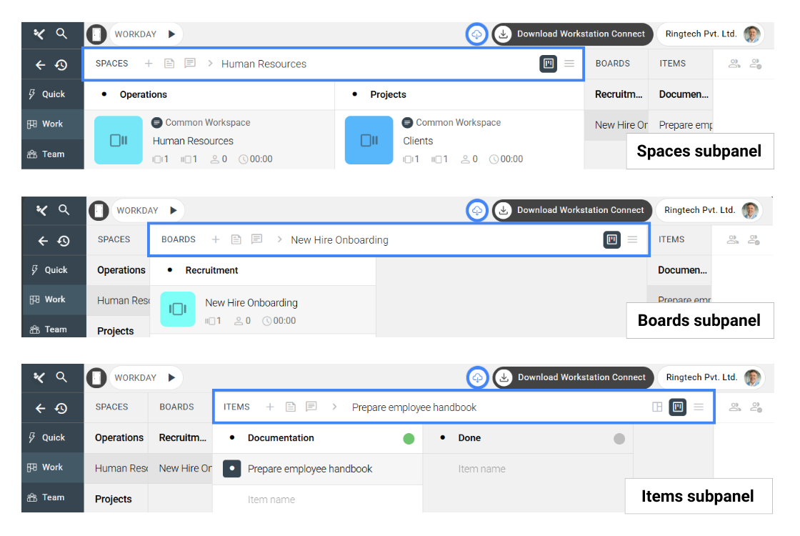 Each subpanel inside the Work panel—Spaces, Boards, and Items—is framed by two rows: the Forehead at the top and the Chin at the bottom. These rows host essential controls and information that help Organization Owners and Workspace Admins manage work more efficiently. While the Forehead and Chin are largely similar across all three subpanels, the Items subpanel includes a few additional controls tailored for task-level management.