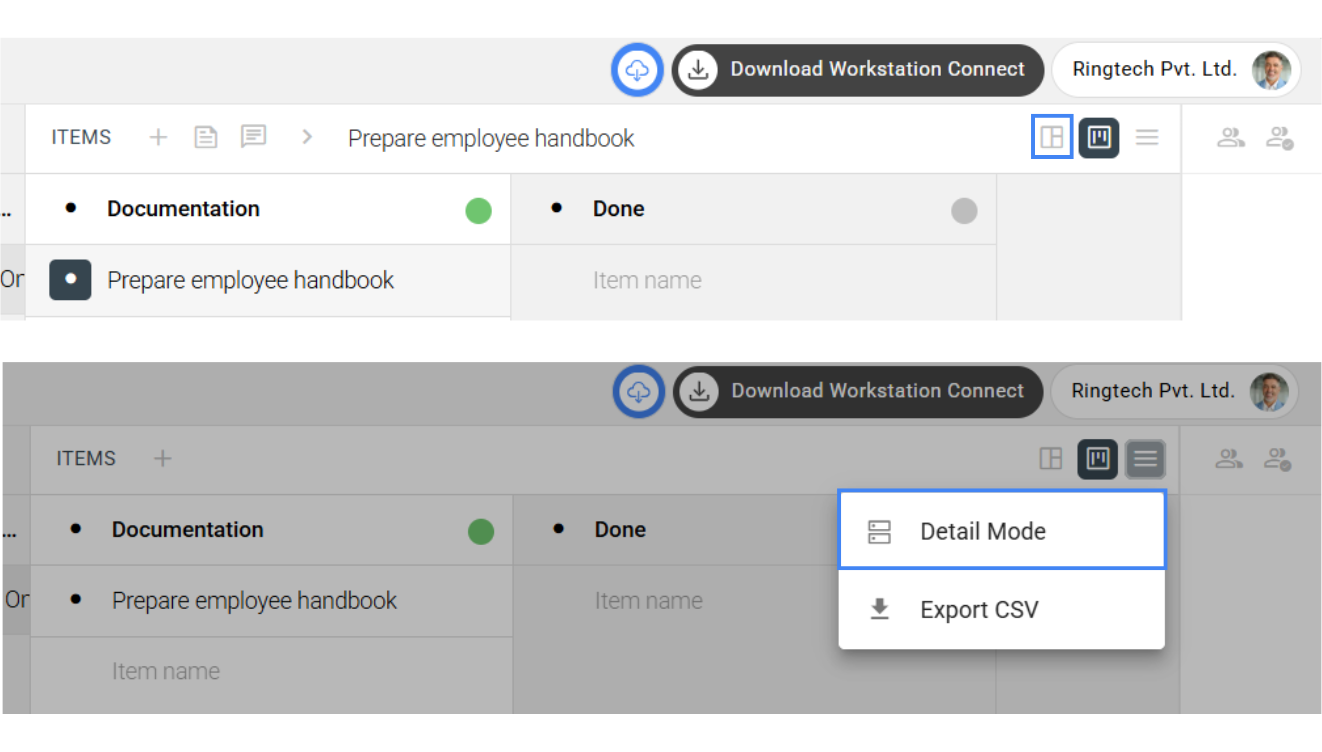 2. Detail Mode (in More Options): In addition to Export CSV, the Options menu includes Detail Mode, a toggle that changes the Items subpanel view from normal to detailed. The detailed view shows extra information on each item tile, such as open/closed status, assigner and assignee avatars, and logged effort.