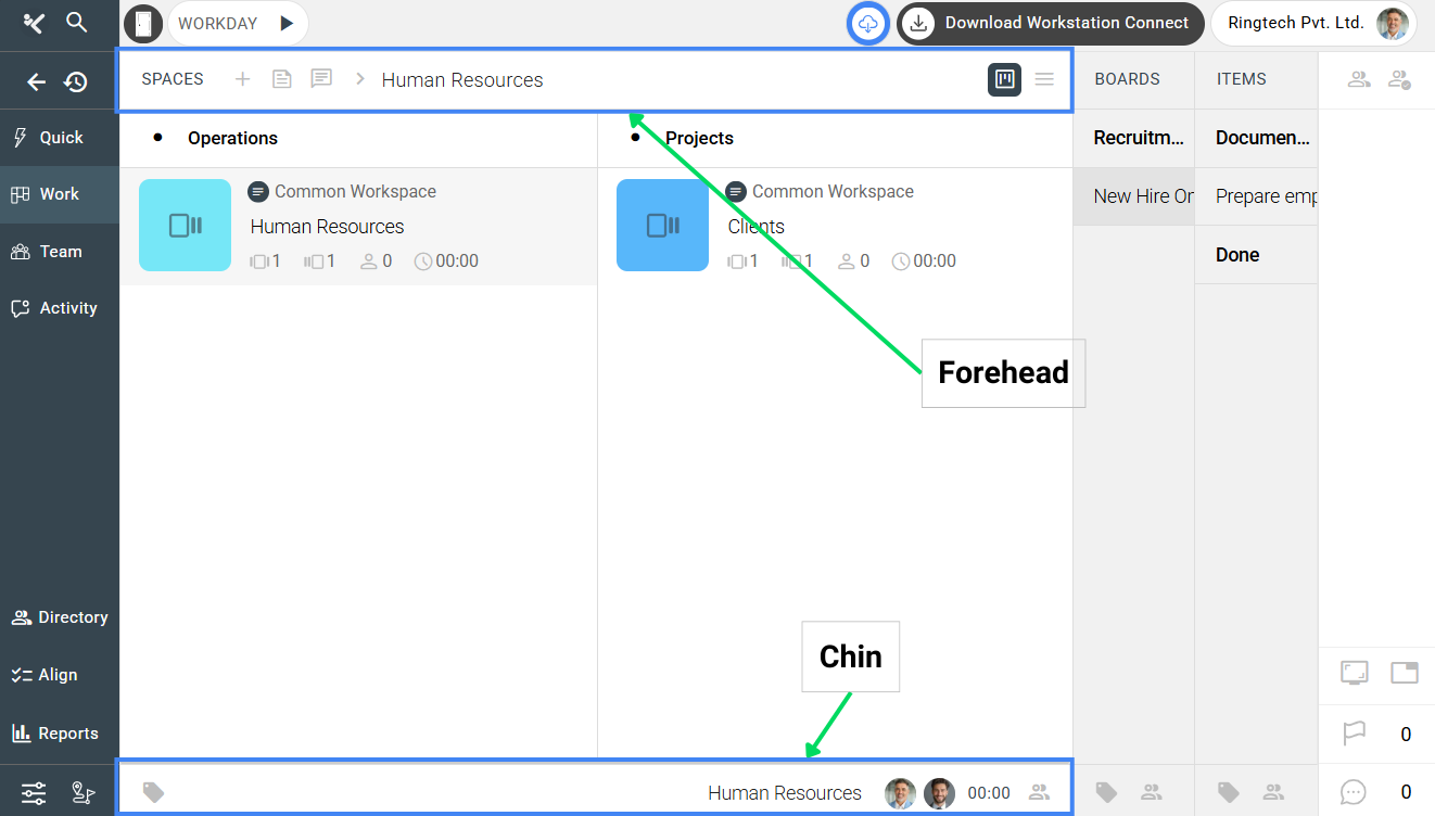To find the Forehead and Chin, open the Work panel from the navigation sidebar. The Work panel contains three subpanels—Spaces (left), Boards (middle), and Items (right). In each subpanel, the Forehead is the top row, and the Chin is the bottom row. Together, they frame the subpanels with quick access to actions, information, and settings.