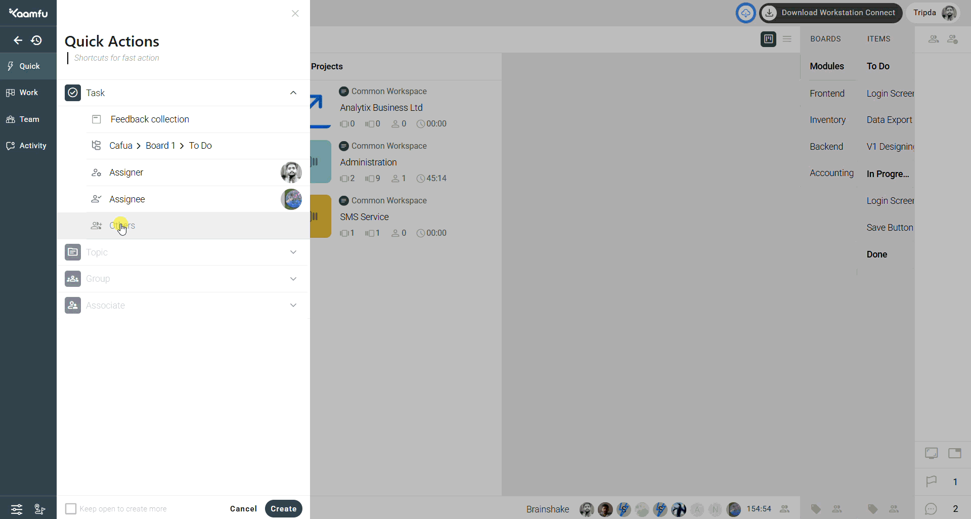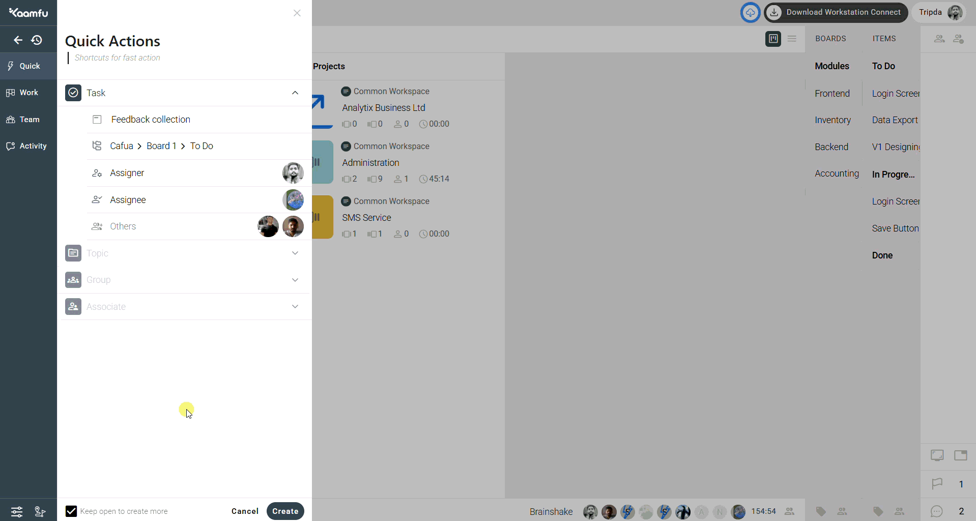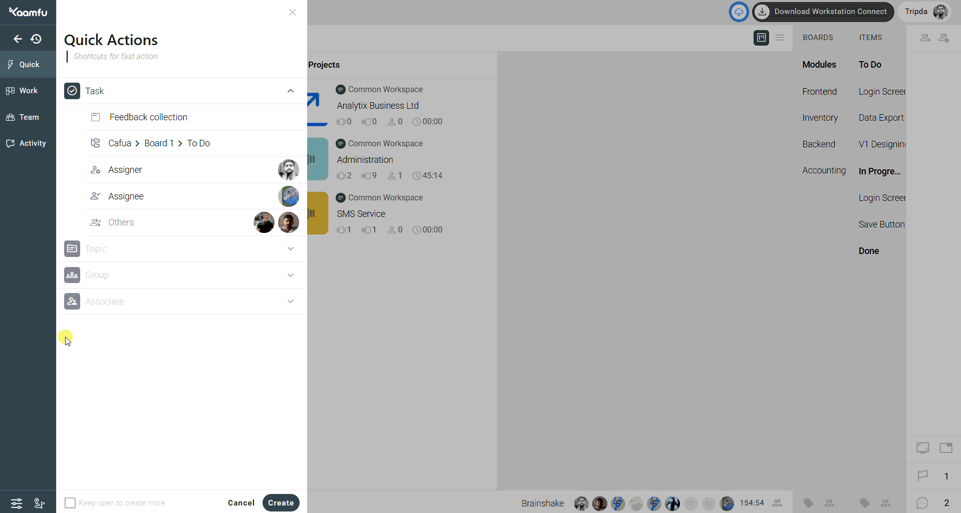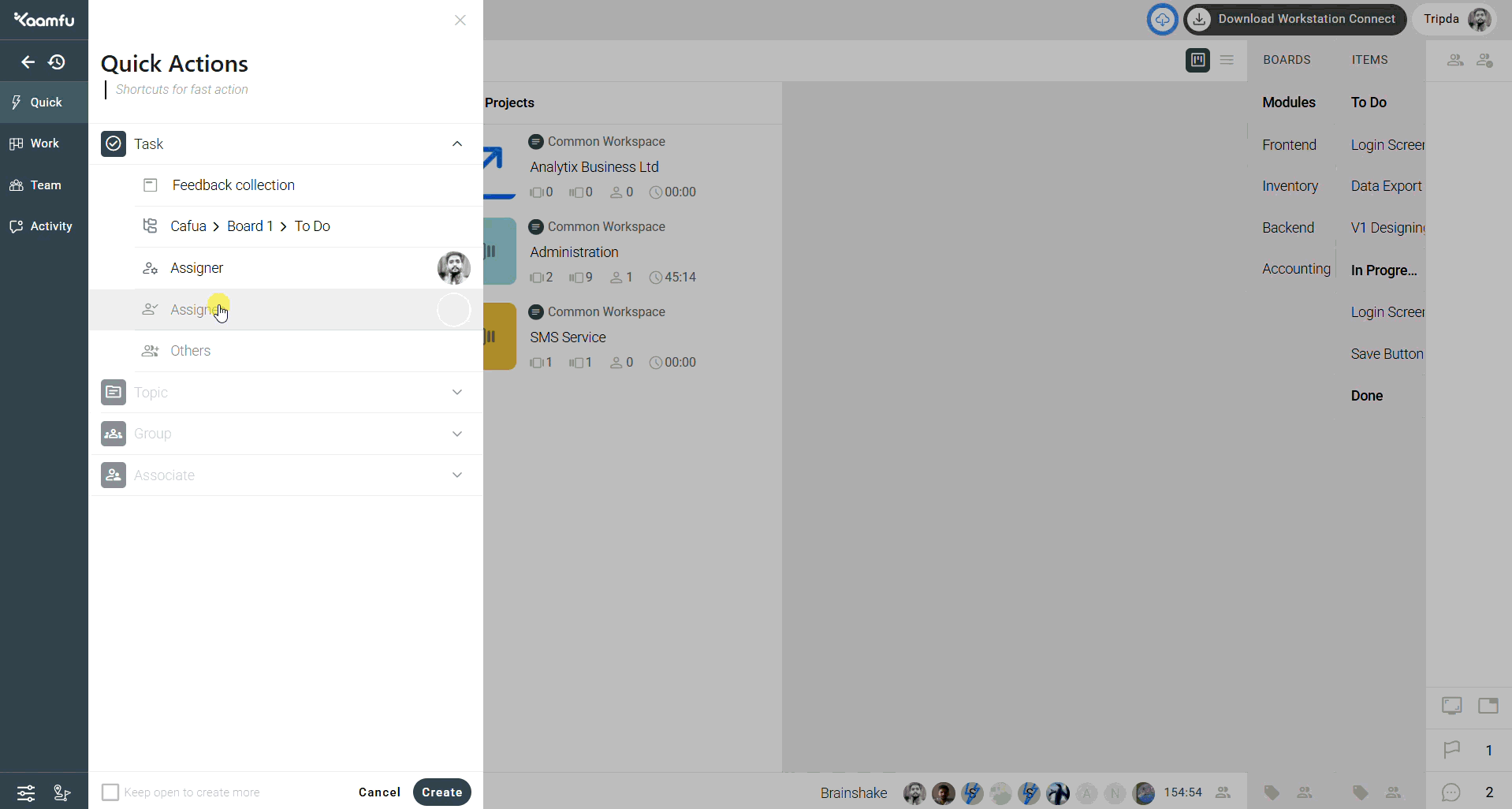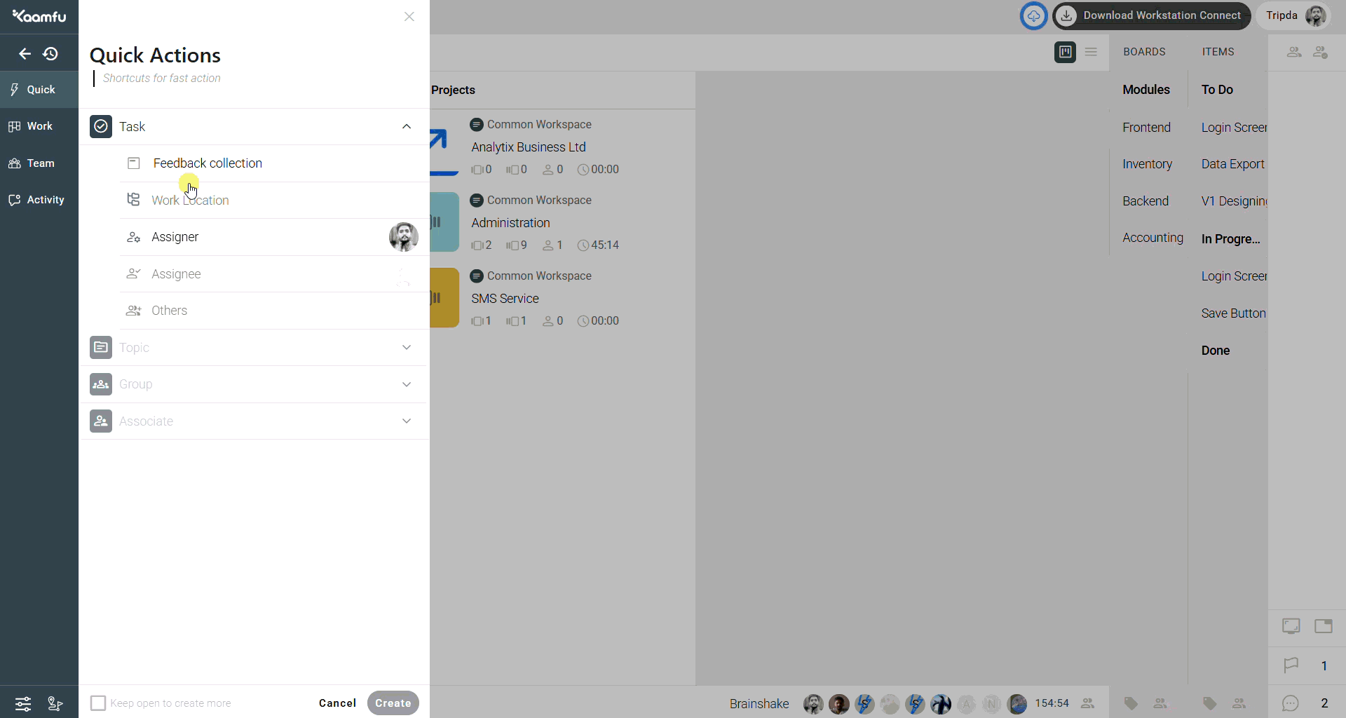 The Quick Actions menu in Kaamfu allows Owners, Account Admins, and Space Admins to create tasks instantly without navigating through multiple screens. This feature is designed to save time and streamline task assignment.