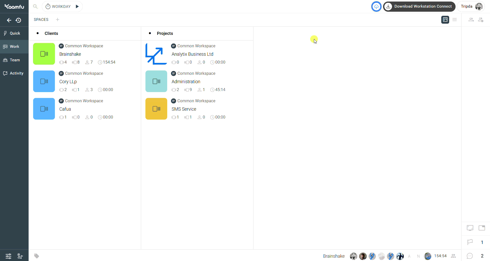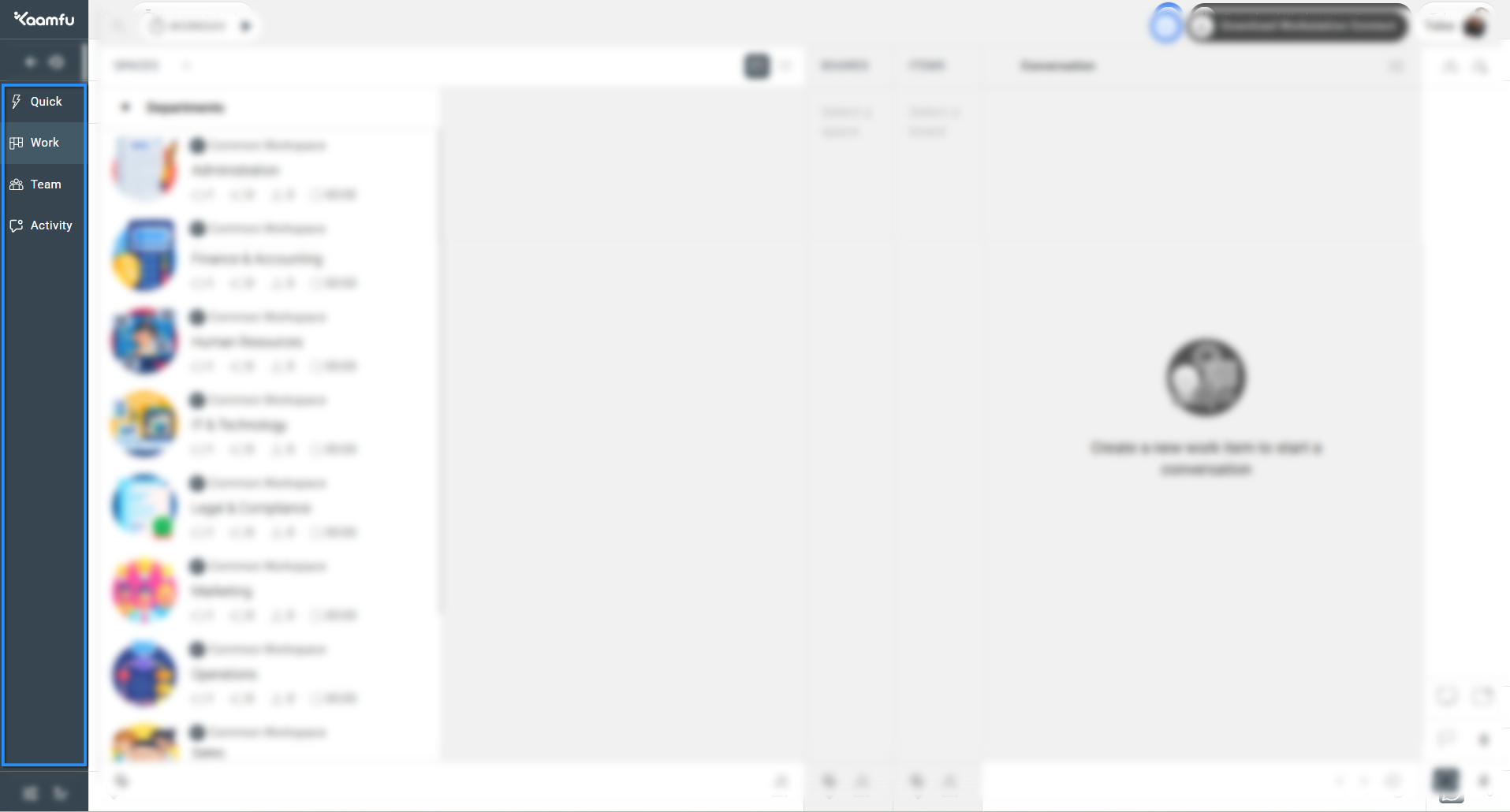 The Navigation Panel in Kaamfu is your central hub for managing work, tracking updates, and supporting your team. It brings together all essential components — workspaces, updates, team insights, and quick shortcuts — in one organized view to streamline collaboration and keep projects on track.