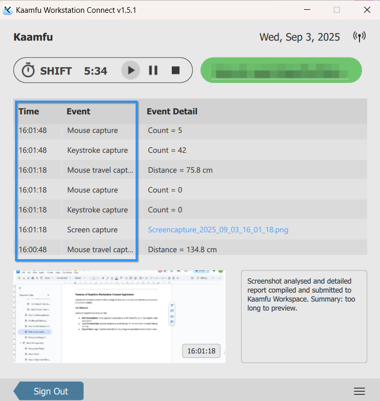 Workstation Connect continuously runs in the background to capture activity data from the employee’s system. These captured metrics are synced with the Kaamfu Web Application, where they can be reviewed by employees, managers, and admins.