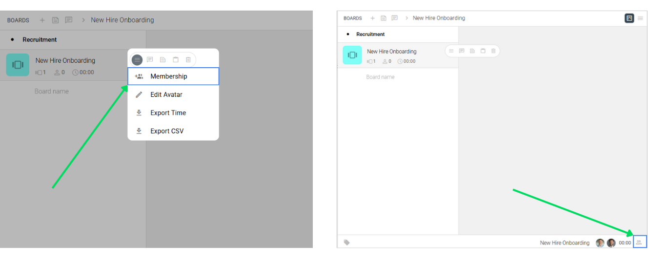 • Through the chin: With the Board Group selected, click the Membership icon in the chin of the Boards subpanel.