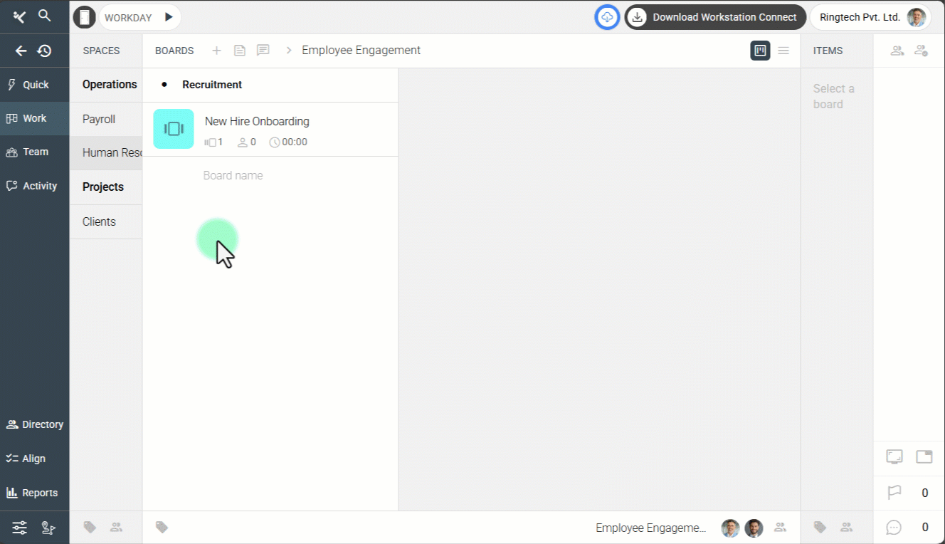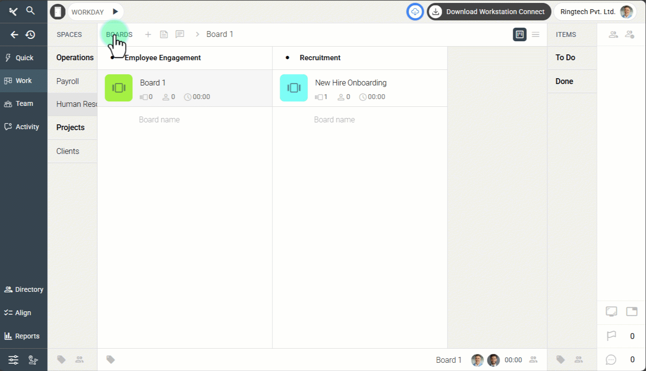With the Space selected, open the Boards subpanel in the Work Panel.
