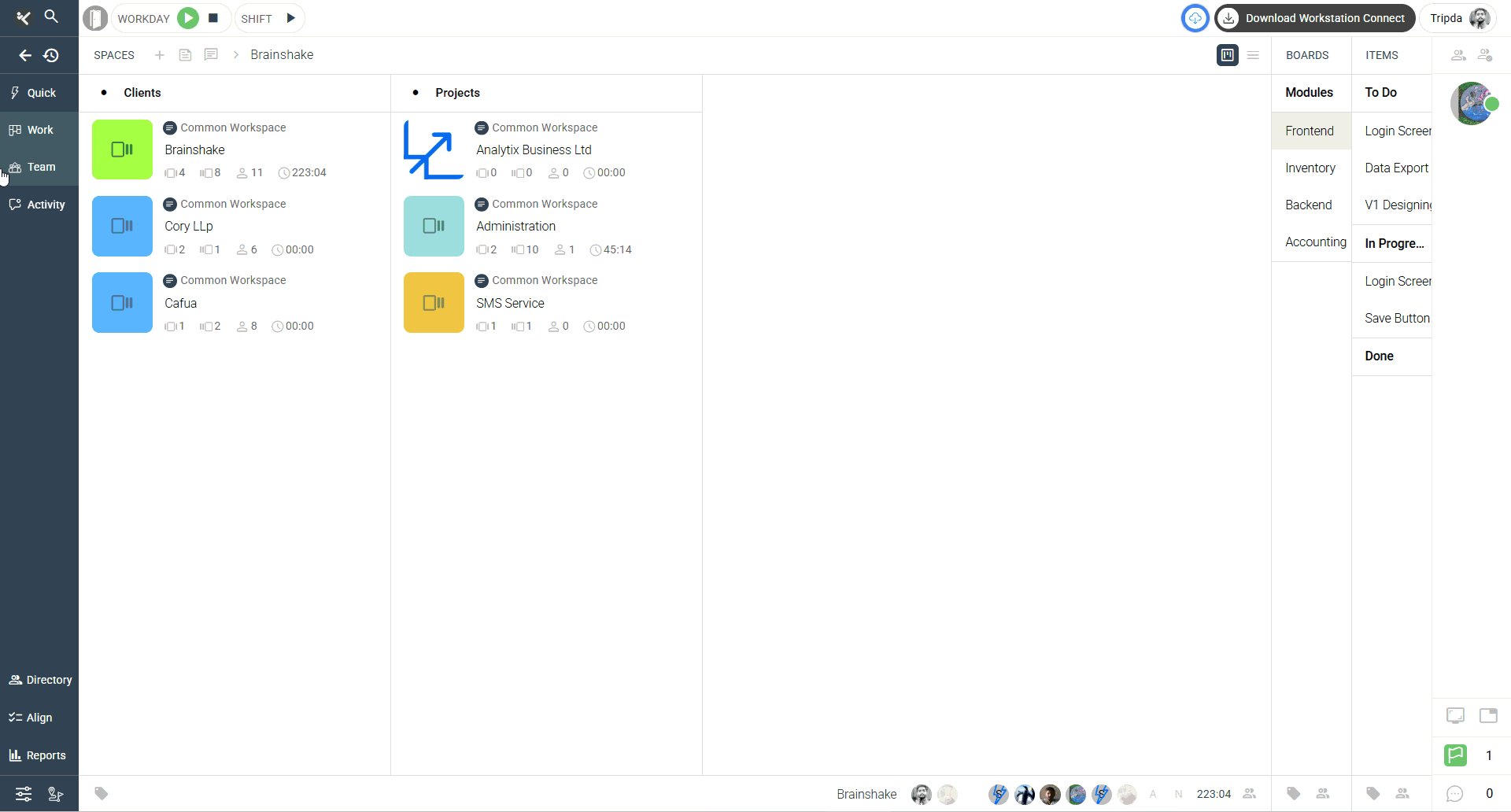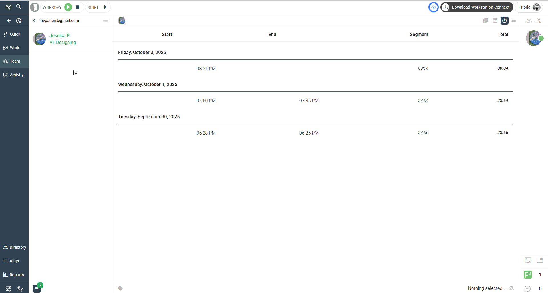 - Clicking on a date opens the detailed workday view in the right panel.